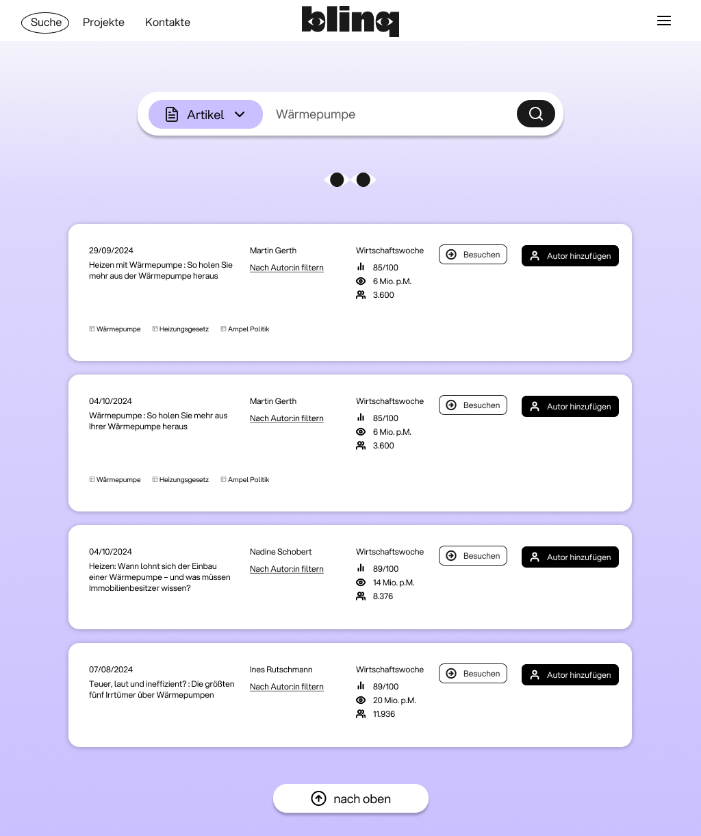 blinq launched in October 2024 and has since grown into an operational startup with paying clients including agencies like RCKT, featured in t3n and Gründerszene, and rated 4.6 stars on OMR Reviews. What started as a journalist search engine has evolved into a full visibility platform. The product today covers three core areas: a real-time PR search engine that scans hundreds of media outlets and over one million podcast transcripts to find the right journalists and hosts for a story; a GEO tool that analyses how a brand appears in LLM responses like ChatGPT and benchmarks it against competitors; and an AI pitch assistant that generates personalised outreach emails based on actual journalist feedback.