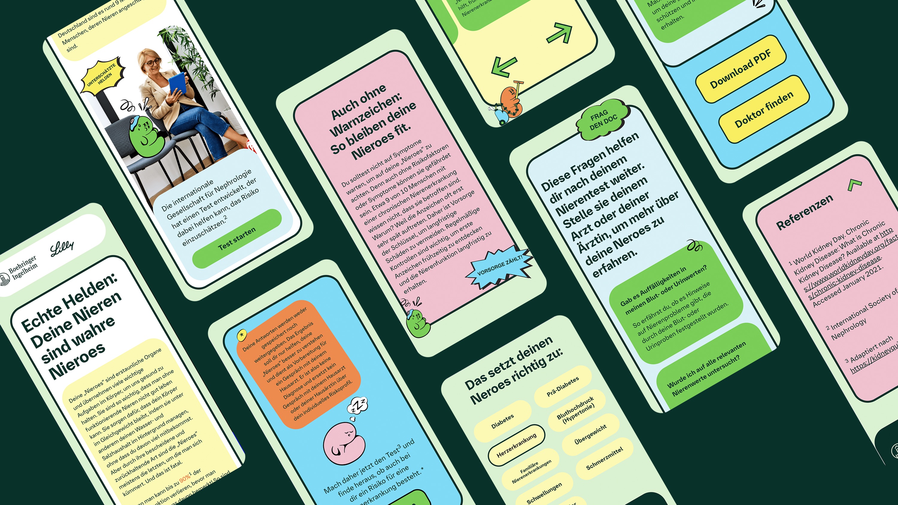 The project resulted in an accessible awareness platform that reframes kidney health through a positive, user-friendly digital experience. Working at RCKT for Boehringer Ingelheim, we developed a landing page and symptom test aligned with an ongoing campaign. Together with another UX/UI designer, I created the test logic: users receive one of three result types depending on how many symptoms they identify with. While the messaging adapts to each risk level, all users are guided toward the same central knowledge section — reinforcing that kidney health is relevant for everyone, whether at risk now or in the future. The outcome is an intuitive, empathetic interaction flow that encourages users to reflect on their health, understand potential risks, and feel motivated rather than discouraged. By shifting away from heavy medical tropes toward a more engaging and supportive experience, the platform helps raise awareness and lowers emotional barriers around a complex health topic.