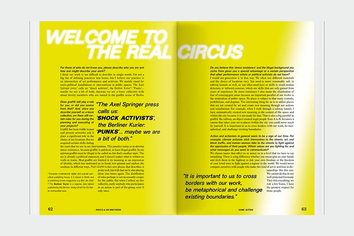 For the 16th issue of Some Magazine, the theme Action required a visual and editorial concept that captures the urgency of a rapidly changing world. The challenge was to design a publication that not only discusses action, but embodies it — in pacing, typography, layout, and storytelling. As part of a rotating student design team, we were tasked with shaping the magazine's visual identity, producing all layouts, and contributing original written and photographic work that reflects the theme from different perspectives.