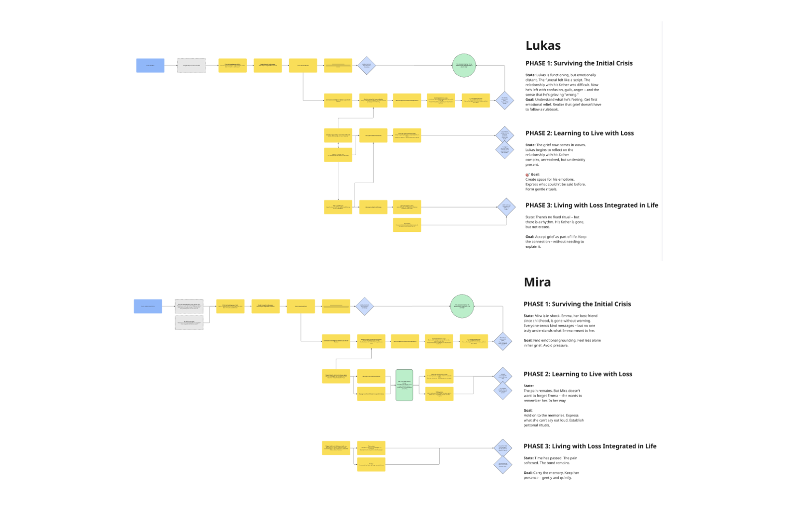 The findings were synthesized into four working theses with concrete design implications: that grief is individual and non-linear; that ongoing bonds and rituals matter deeply; that grief is increasingly detached from physical places; and that technology in this context raises real ethical questions around privacy and autonomy. These theses then shaped two detailed user scenarios, Lukas grieving a distant father and Mira processing the sudden loss of her best friend, which grounded every interaction model and feature decision in real emotional contexts rather than assumptions.